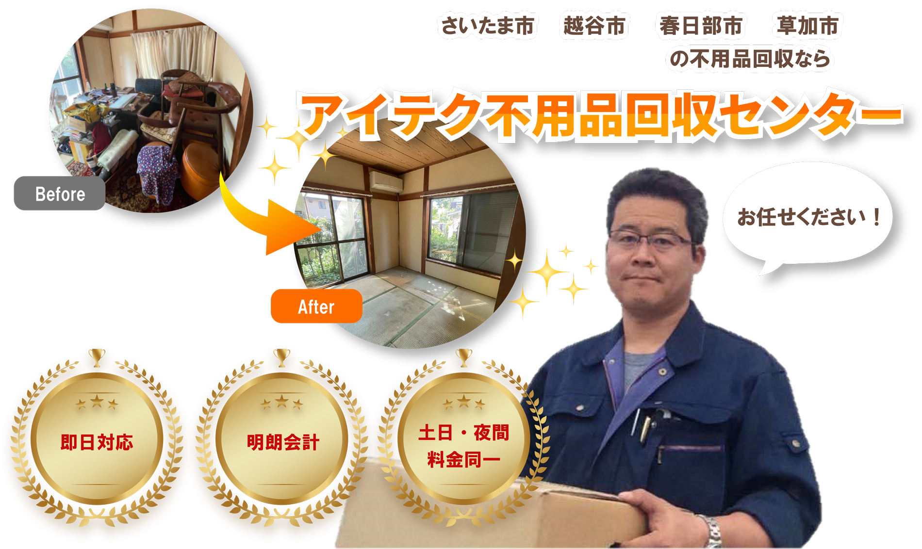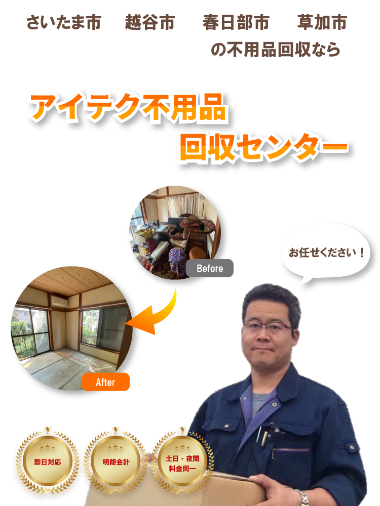 引越しに伴う不用品処分、親族の遺品整理の際の不用品処分などは緊急の場合も少なくありません。使わないものをいつまでも家に置いておくのも邪魔になってしまいますよね。アイテク不用品回収センターでは、このように「すぐに回収に来てほしい」「急遽不用品を処分しなければならなくなった」というお急ぎのケースでも最短即日に回収に伺います。越谷市・草加市・春日部市・さいたま市近辺であれば、午前中にご連絡いただいてその日の午後に回収を終えることも可能なので、緊急の場合もお気軽にお問い合わせください。